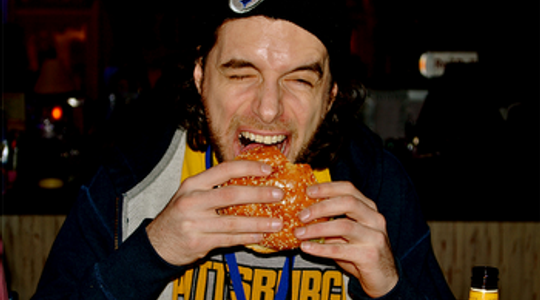 Gregg Gillis (a.k.a Girl Talk). His new album, "All Day", shut down the internet for a day. After releasing one of the most highly-anticipated albums of the year, Gregg began his 2011 "All Day" tour by selling out every show throughout his January and February tour. After his sold-out performance at Dallas' Palladium Ballroom, we took he and the Girl Talk live crew out for some late-night food at one of our favorite burger spots, the Twisted Root Burger Company on SMU Blvd. across Central Expressway in Dallas.